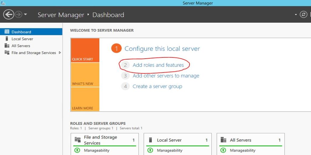 Then in Server Manager window click on option "Add roles and features" option.