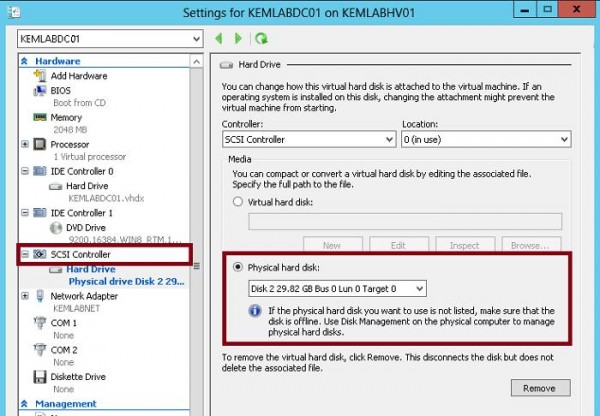 - Run Hyper-V Manager and open the properties of the virtual machine, to which a USB drive needs to be connected. In the SCSI Controller section, add a new disk, indicating that it is physical (Physical hard disk). In the drop-down menu, choose our 30 GB drive.Note. You don’t need to turn the virtual machine off to add a SCSI hard drive, since they support both Hot-Add and Hot-Remove technologies.